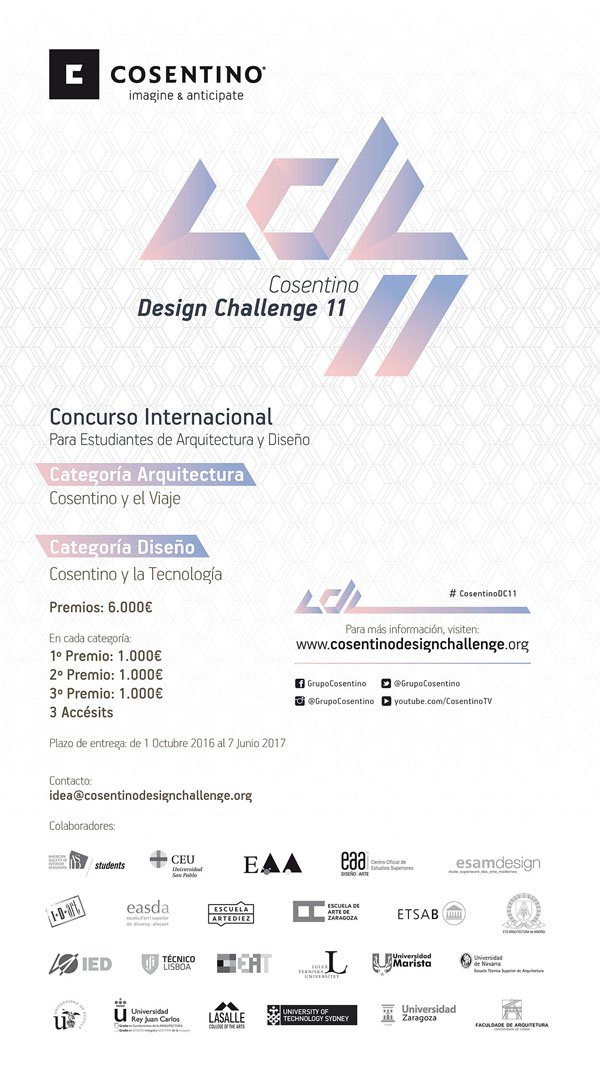 Ya está abierta la 11ª edición del concurso internacional Cosentino Design Challenge, que un año más invita a todos los estudiantes matriculados en el curso académico 2016-2017 en cualquier centro o escuela superior de diseño, arquitectura, arquitectura de interiores u otras áreas de conocimiento similares, a investigar sobre la configuración de espacios, materiales y sistemas constructivos a través de la experimentación con productos Consentino. Los proyectos, que podrán presentarse hasta el 7 de junio de 2017 a cualquiera de sus dos categorías: Diseño –que este año propone reflexionar sobre Cosentino y la Tecnología– o Arquitectura –en torno a Cosentino y el Viaje–, deberán cumplir como único requisito el incluir algún producto de Cosentino. Compuesto por un profesor de cada una de las escuelas colaboradoras, un arquitecto o diseñador de reconocido prestigio internacional y un representante de Cosentino, el jurado entregará en cada una de las categorías tres primeros premios –dotados con 1.000 euros cada uno-, tres accesit y las menciones especiales que considere oportunas. Los interesados podran presentar sus propuestas a través de la propia web del concurso.