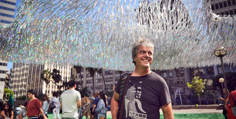 Una enorme estructura de casi 1.400 metros cuadrados que flotaba sobre la Plaza Pershing sorprendió una mañana a los vecinos del centro de Los Ángeles. Allí, había trabajado durante toda la noche Patrick Shearn, del estudio de diseño Poetic Kinetics, junto a un grupo de estudiantes de arquitectura, para montar esta impresionante obra, llamada Liquid Shard. Una pieza de mylar holográfico y monofilamento que se elevaba en el aire desde de 4,5 metros del suelo y hasta alcanzar los 35 metros de altura. «La inspiración surge de la observación de la naturaleza y de la sensación de que sólo somos conscientes a un nivel muy superficial de lo que realmente sucede a nuestro alrededor. Cosas insólitas se revelan en los time-lapse o en la fotografía hiperespectral que me fascinan. Como fractales que se repiten progresivamente, sentimos las corrientes de aire en nuestra piel pero no vemos esos grandes movimientos. Yo quería que Liquid Shard jugara en esa realidad», comenta Shearn. El proyecto brindó a los espectadores la oportunidad de ralentizar el movimiento del viento y observar el modo en que éste transformaba la pieza suspendida en el aire. Un gran e hipnótico mar flotando, ofreciendo un espectáculo único de luz, contraste y movimiento, ideal para cortar con la ajetreada dinámica de la ciudad y abrirse a la realidad oculta tras ella.