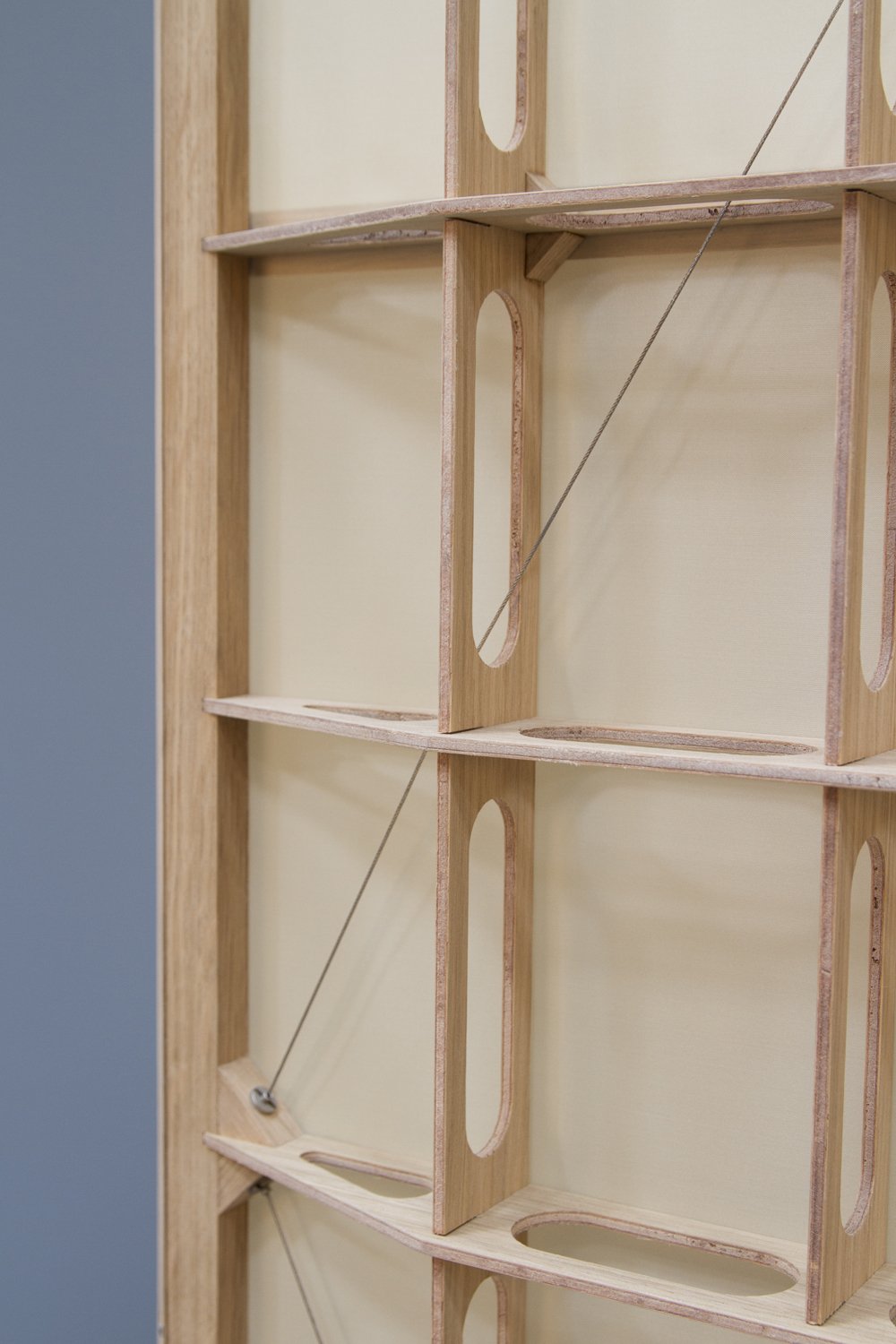 El reto consistía en diseñar un armario capaz de ser ligero y estable a la vez. Para ello, el estudio se inspiró en las alas de los aviones producidos a principios del siglo XX, que contaban con ligeras estructuras de madera cubiertas por textiles. El objetivo era lograr el equilibrio adecuado entre estabilidad y peso ideal. El material principal son chapas de roble Decospan, combinadas con cables de acero y poliéster para dar forma a la estructura del armario. El nombre, Airframe 01, es un término de aviación que hace referencia a la estructura de una aeronave sin los motores, algo que, según los diseñadores es exactamente lo que tenían en mente, “un armario que podría volar”.