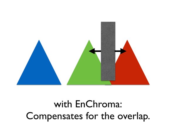 Conseguir que la luz sea absorbida por los tres fotorreceptores en las proporciones adecuadas es fundamental para la correcta percepción del color, algo que no ocurre en el daltonismo, donde la superposición de los fotorreceptores rojos y verdes hace imposible diferenciar tonalidades en realidad muy distintas. EnChroma funciona restableciendo el equilibrio correcto entre las señales de los tres fotopigmentos en el ojo, «reesculpiendo» las curvas para obtener así una respuesta normal a la luz. Dado que no hay daños a nivel neuronal, una vez se reestablecen las proporciones adecuadas los colores se perciben con normalidad, siempre tras un periodo de aprendizaje y adaptación de entre unos cinco y 15 minutos.